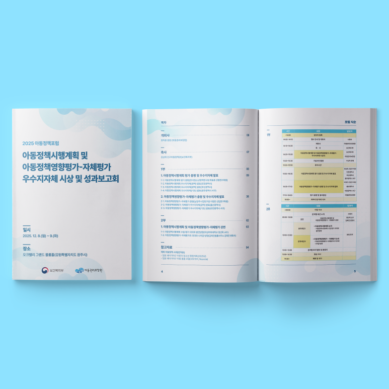 맑고 깨끗한 하늘과 바다를 연상시키는 블루 톤을 메인 컬러로 사용하여, 아동의 밝은 미래와 정책의 투명성, 신뢰도를 시각적으로 전달했습니다. 화이트 배경과의 조화는 방대한 텍스트 정보를 더욱 깔끔하게 보이게 합니다.