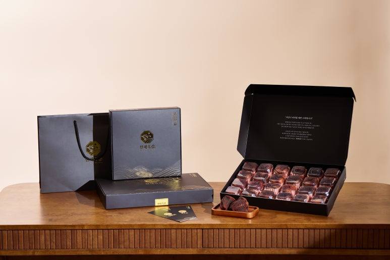 프리미엄 선물 시장을 겨냥하여, 무게감 있는 매트 블랙(Matt Black)을 베이스로 하고 화려한 금박(Gold Foil)을 포인트로 사용하여 압도적인 고급스러움을 연출했습니다. 블랙 패키지는 흑곶감 특유의 검붉은 빛깔을 더욱 돋보이게 하며, 받는 이에게 귀한 선물을 받는다는 자부심을 심어줍니다.