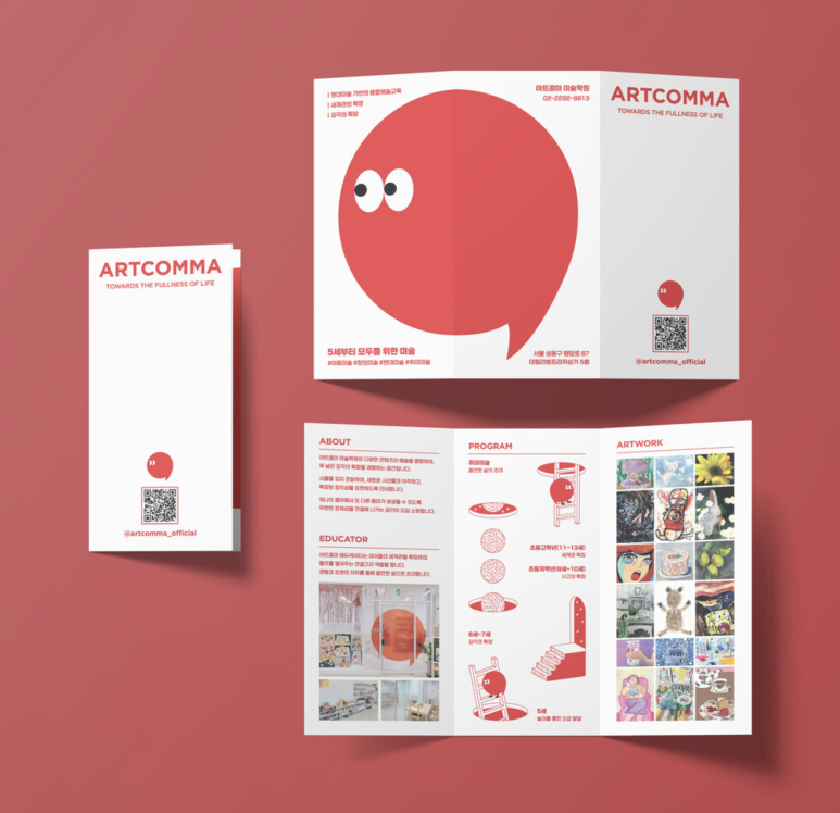 이번 리플렛은 ARTCOMMA 아트콤마 미술교육 브랜드의 교육 철학, 수업 프로그램, 작품 사례를 소개하는