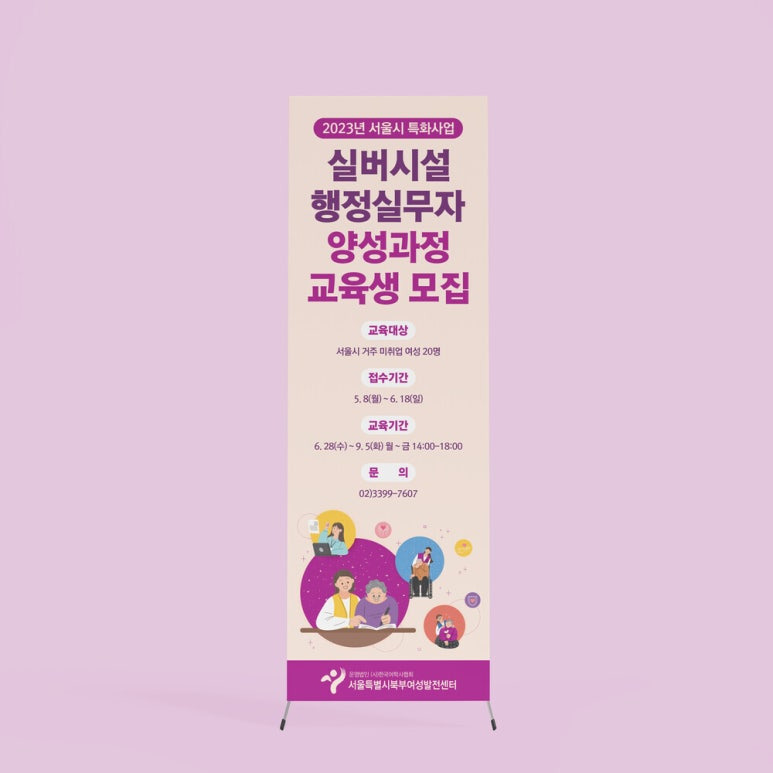 이번 작업은 서울북부여성발전센터의 실버시설 행정실무자 양성과정 교육생 모집을 위한 X배너 디자인입니다.