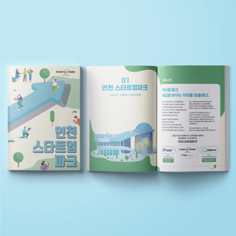 이번 작업은 인천 스타트업파크의 사업 전반을 소개하는 책자 디자인입니다. 혁신 기업들의 거점 공간으로서의